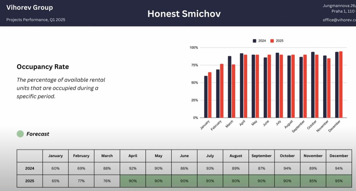 - Honest Smíchov: Lançado em 2019, manteve uma ocupação superior a 75% no primeiro trimestre, mesmo com sazonalidade mais fraca. Estão a ser feitas melhorias nas unidades, como a substituição de camas, com base no feedback dos hóspedes.