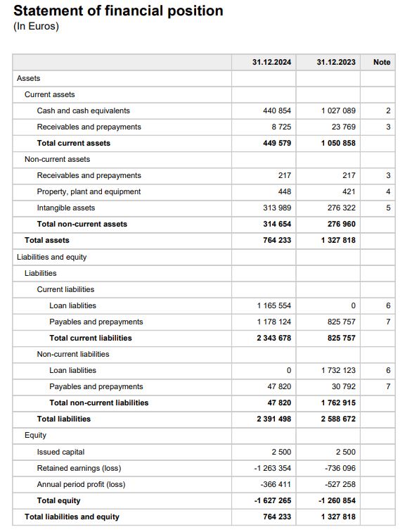 - Caixa e equivalentes (dinheiro em banco): caiu de 1,0M € (2023) para 441k € (2024). Estão a gastar dinheiro mais rápido do que geram.