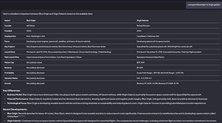 A pesquisa Co-Pilot foi melhorada para fornecer respostas qualitativas mais detalhadas, combinando os dados principais do FinChat com informações de domínio público para lidar com casos específicos. Um exemplo é a comparação entre empresas públicas (Virgin Galatic) e privadas (Blue Origin).