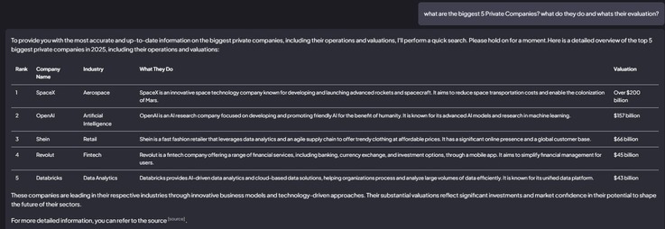 A estrutura das respostas geradas por IA foi otimizada para incluir formatação tabular, facilitando a digestão das informações. Isso é particularmente útil para comparações de múltiplos pontos, como uma lista das cinco maiores empresas privadas.