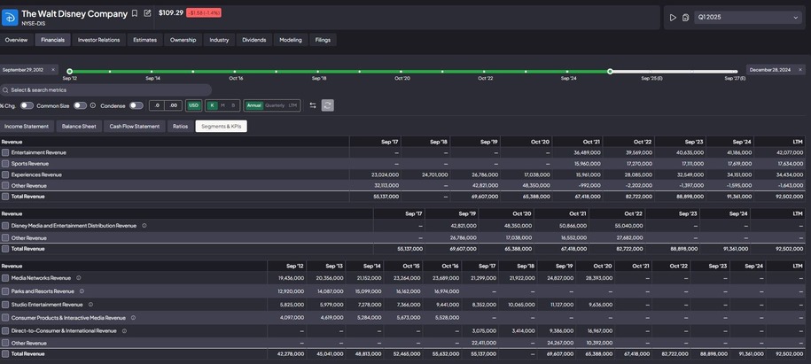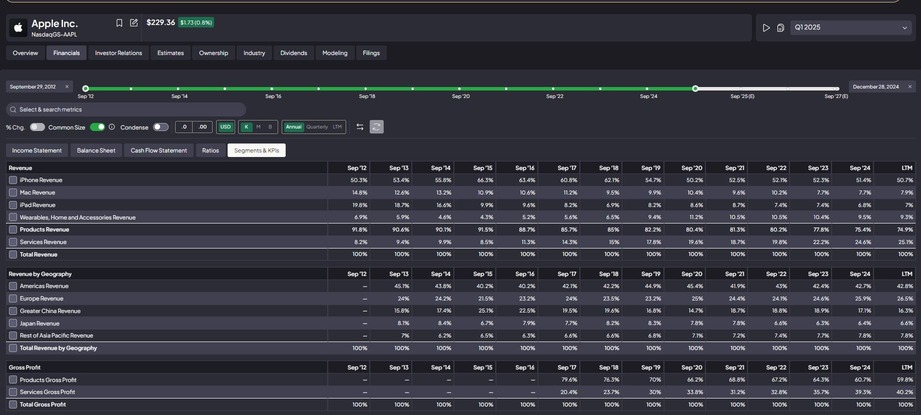 A funcionalidade de common size financials foi adicionada a todos os conjuntos de dados, facilitando a análise de margens e comparações entre empresas. Exemplos incluem a análise dos segmentos da Netflix e das categorias de produtos da Apple.