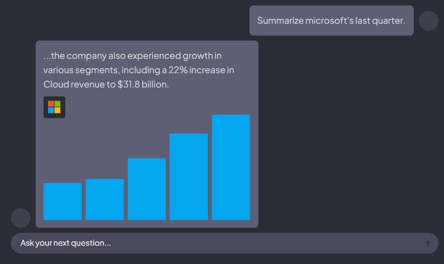 - Um chatbot que responde a perguntas sobre métricas financeiras e tendências de mercado.