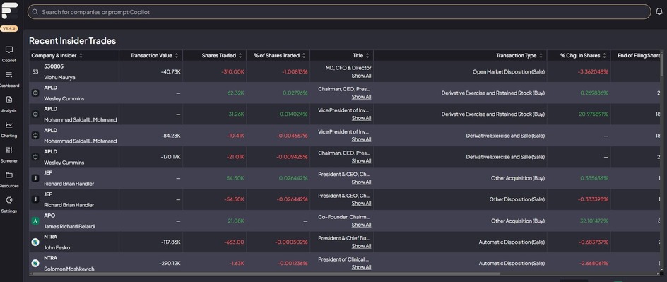 A aba de recursos foi expandida para incluir um Insider Trades Feed, que permite monitorizar transações de executivos em todas as empresas, além de cartas de fundos de hedge e relatórios de investidores.